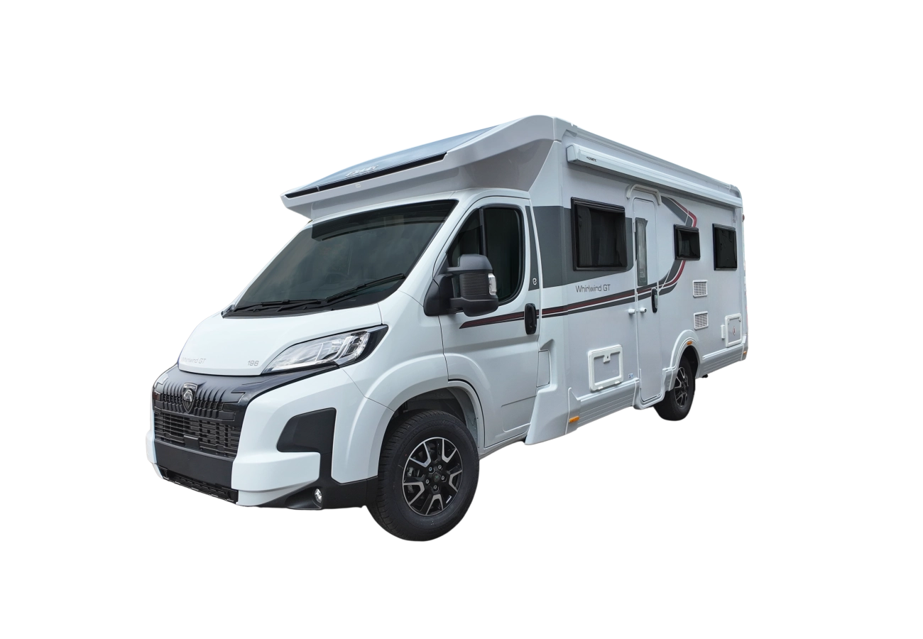 The Whirlwind GT range by Elddis delivers exceptional touring value without compromise. These models combine function with everyday affordability. Outside, a modern colour graphic and Whirlwind GT badging give the range a clean, confident presence. Inside, the light wood interior is paired with durable, darker.