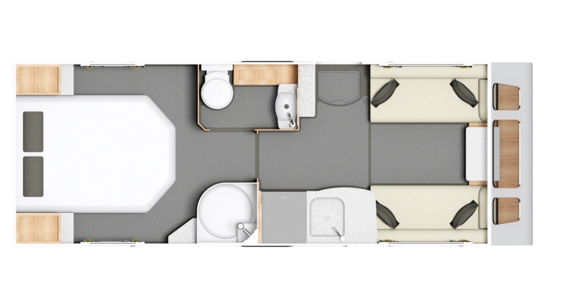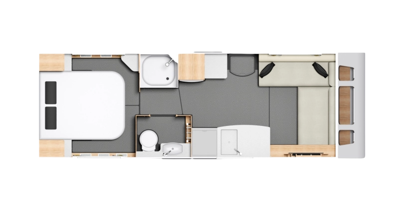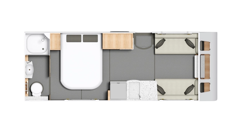 The Crusader Mistral offers a modern take on the 4-berth single-axle caravan, featuring an open and airy rear bedroom and bathroom layout..