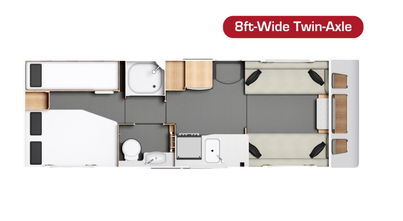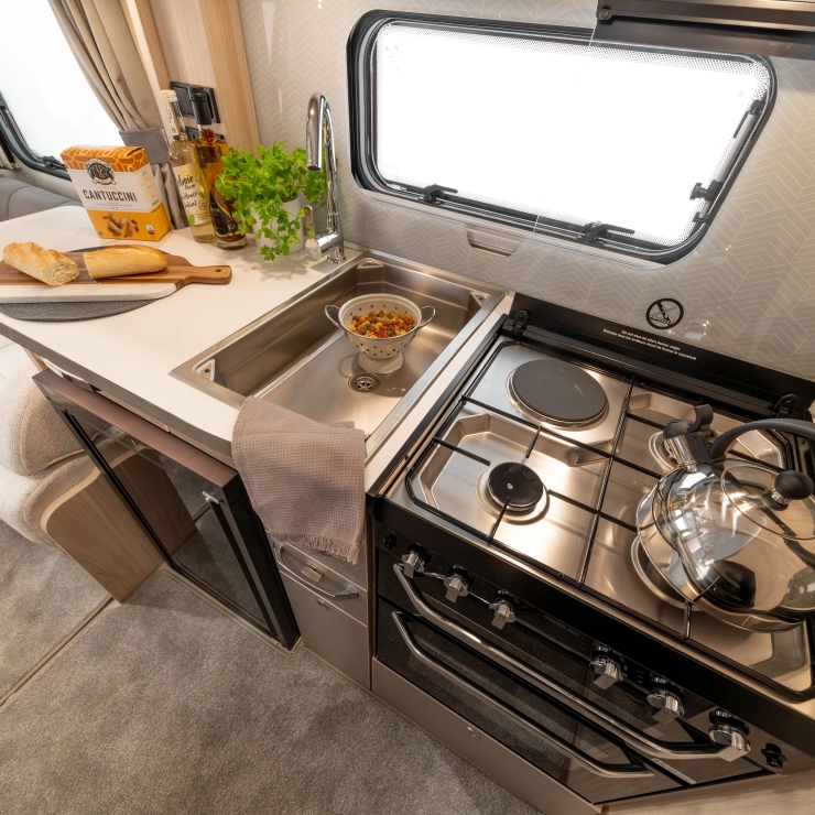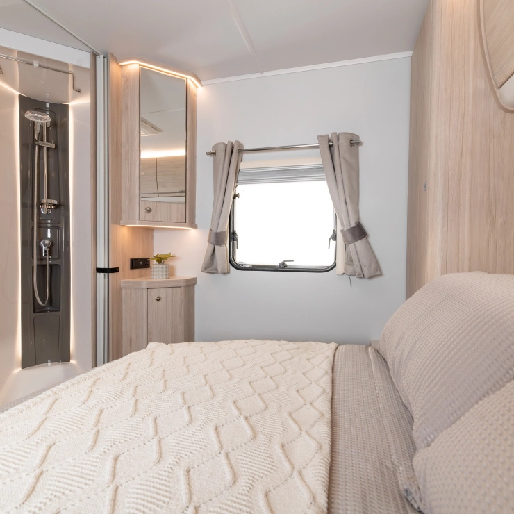 The Crusader Zephyr is a twin-axle, 4-berth caravan offering a luxurious rear bedroom with a 6’3” retractable double bed. Its centrally located separate washroom and shower can be closed off for a spacious en-suite or daytime use, providing flexibility for couples or families.
