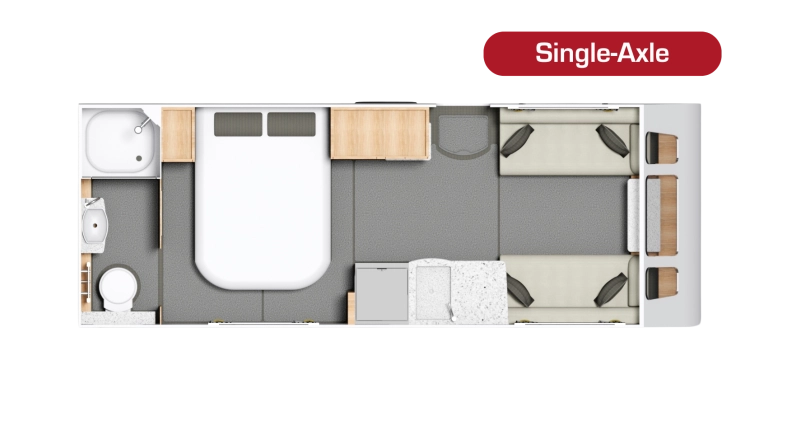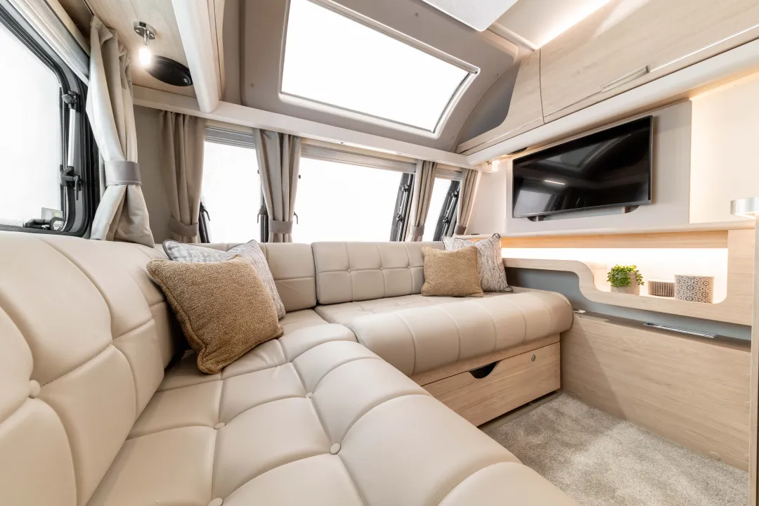 The Crusader Mistral offers a modern take on the 4-berth single-axle caravan, featuring an open and airy rear bedroom and bathroom layout. Its design opens up the central area, providing an impressive view throughout the caravan.
