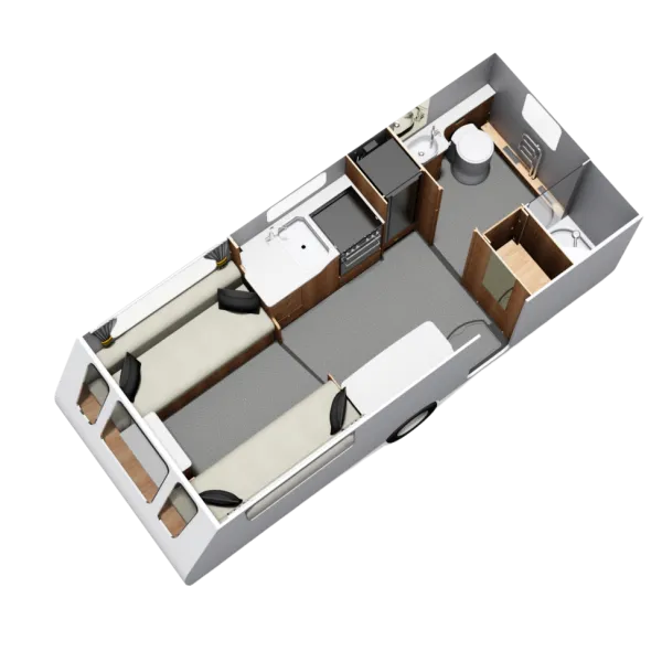 The Crusader Hurricane is a 2-berth luxury tourer with a spacious front lounge and a full-width boutique washroom at the rear. Its open-plan design, AL-KO chassis, Alde heating, and insulation deliver year-round comfort. Ideal for couples who value style, space, and practicality on the road.