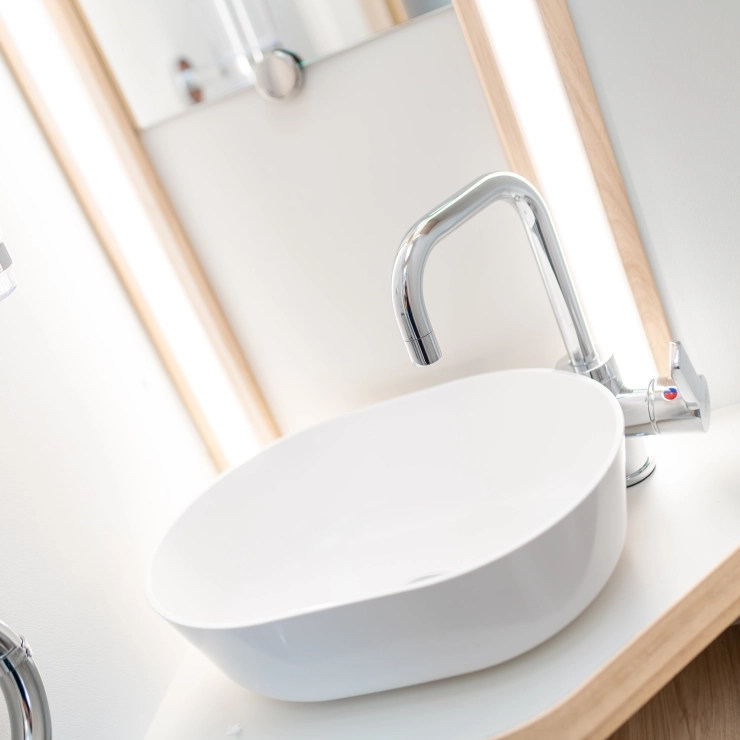 • ‘Boutique’ washbowl basin with click-clack plug and swan-neck mixer tap