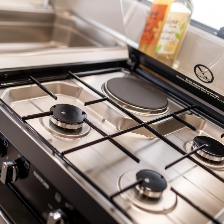 • Thetford K1520 MK2 Black gloss enamelled oven, grill and dual fuel hob with spark ignition and 800w electric hotplate, three gas burners with smoked glass lid.