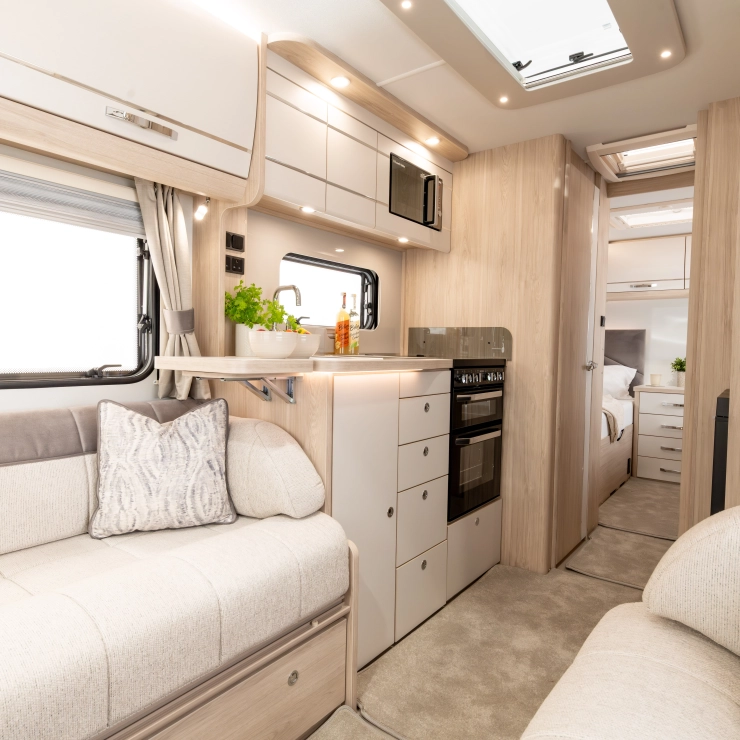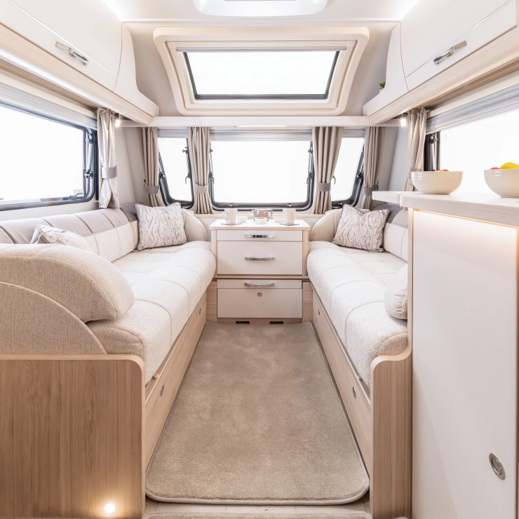 Built for year-round travel, every Crusader comes equipped with ALDE central heating, and superior insulation—perfect for those who tour in all seasons. The range combines bold exterior styling with refined interior aesthetics, including light coloured wood cabinetry, soft-touch fabrics, and modern, multi-texture upholstery. The newly expanded Crusader line-up includes a wider variety of layouts—including standard-width single axles, 8ft-wide single-axles, and 8ft-wide twin-axles—offering more choice to suit individual touring styles.