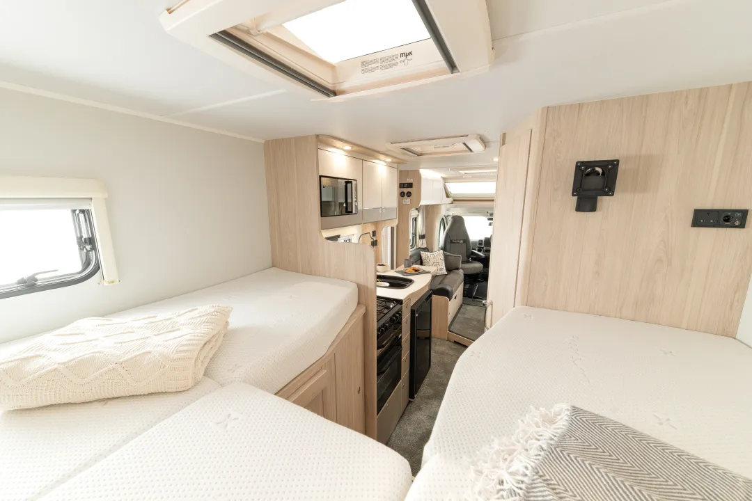 Twin single beds flank the spacious rear washroom in the Autoquest Apex 185, creating a practical 4-berth layout ideal for mixed-group travel. Resin logos, Halotec panels, and an XT pack option ensure this model delivers both luxury and functionality on every journey.