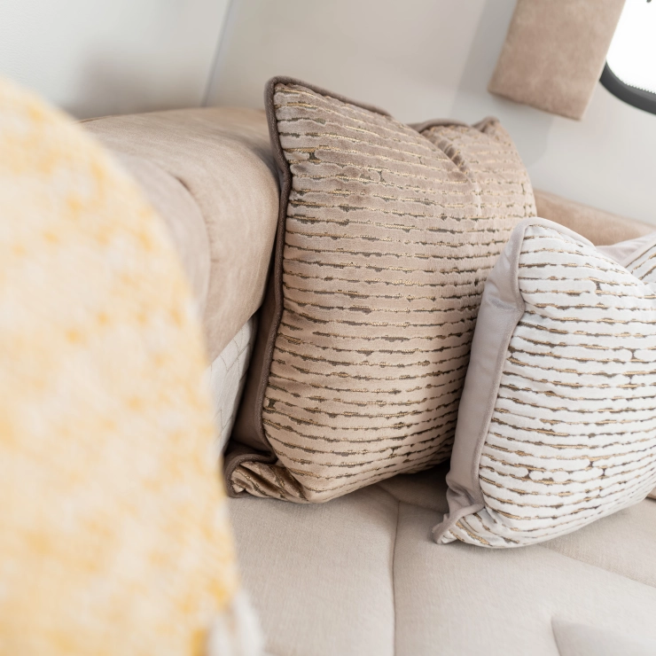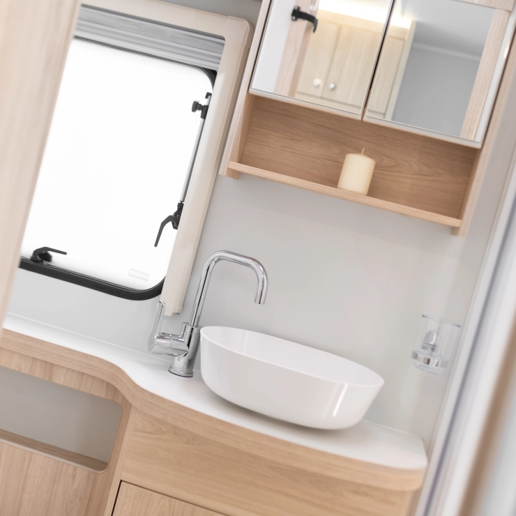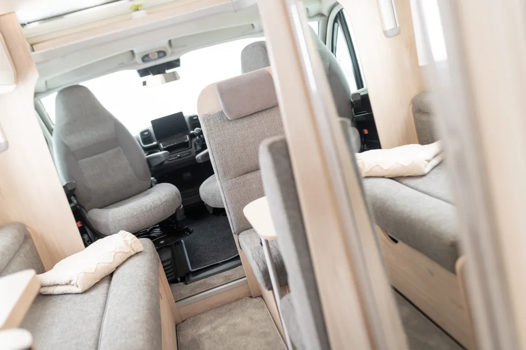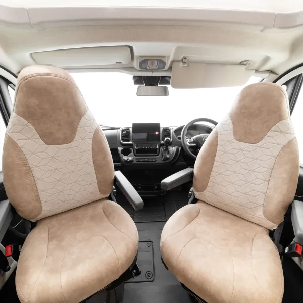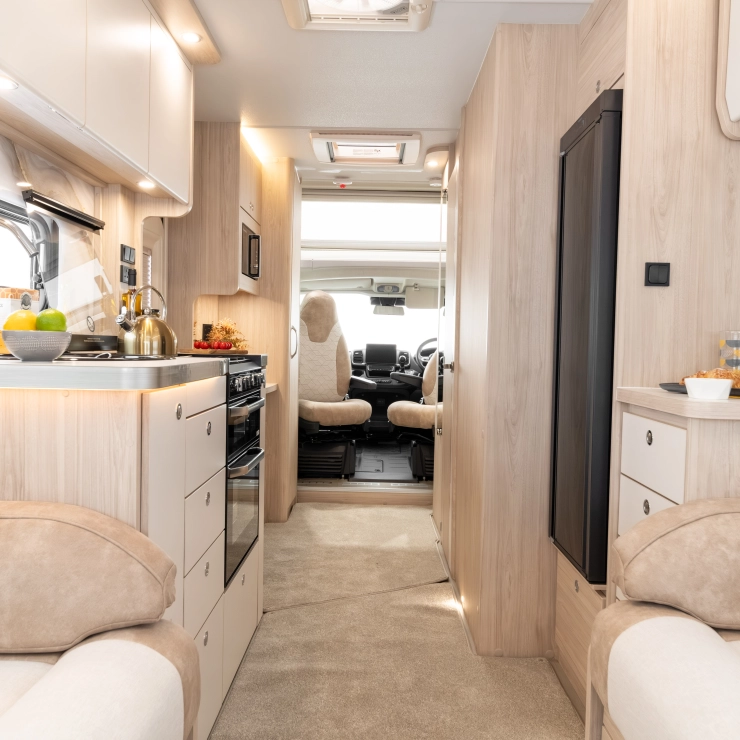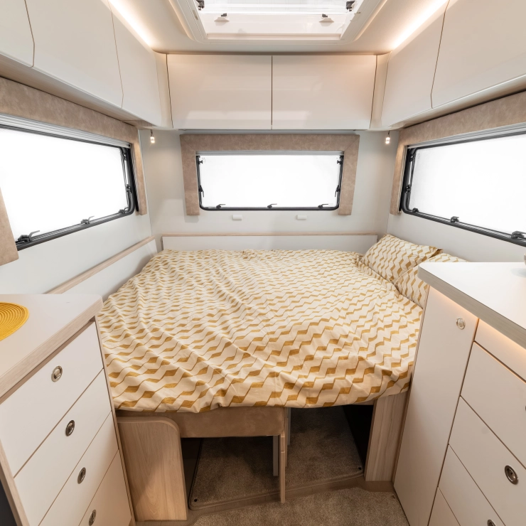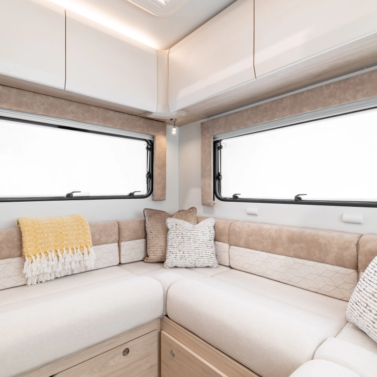 Designed for comfort, the Avalon Evolve 285 features fixed single beds and a spacious full-width rear bathroom. The front lounge converts to a double bed, with foldaway travel seats neatly hidden beneath. Perfect for couples desiring flexibility and luxury.