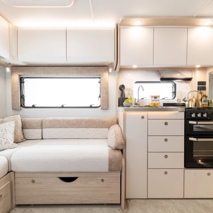 The Avalon Evolve 250 offers a luxurious island bed flanked by spacious wardrobes, creating a bright and comfortable living space. The front lounge converts into an additional double bed, with foldaway Aguti travel seats beneath the bench seating. Ideal for couples seeking elegance and flexibility.