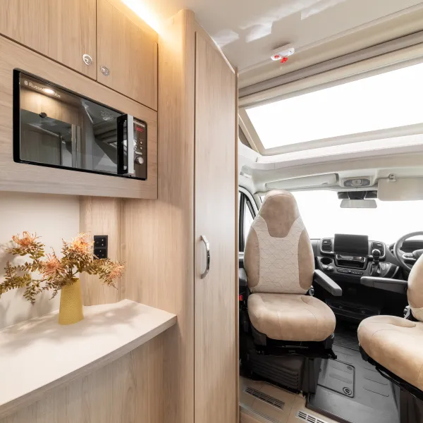 The Avalon Evolve 295 is a luxurious 2-berth motorhome focusing on a light-filled rear lounge that converts into a large double bed or two singles. It boasts a spacious bathroom with a separate shower and a well-equipped kitchen, offering a truly indulgent experience for couples.