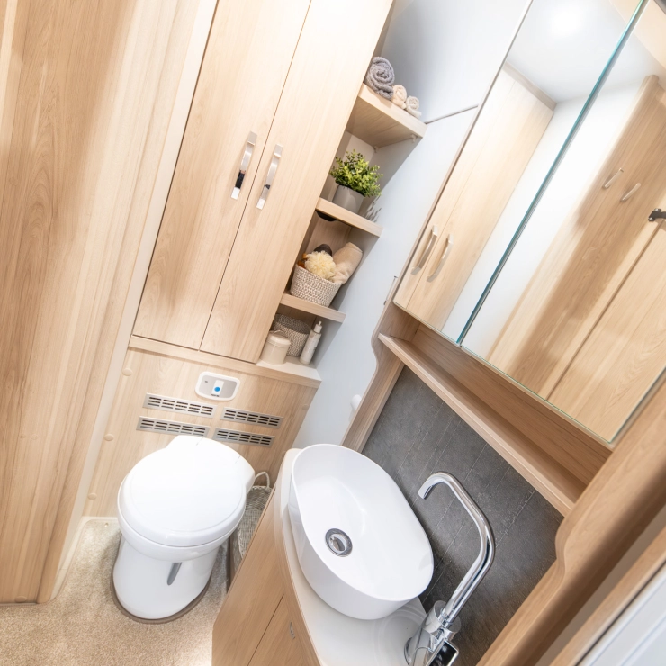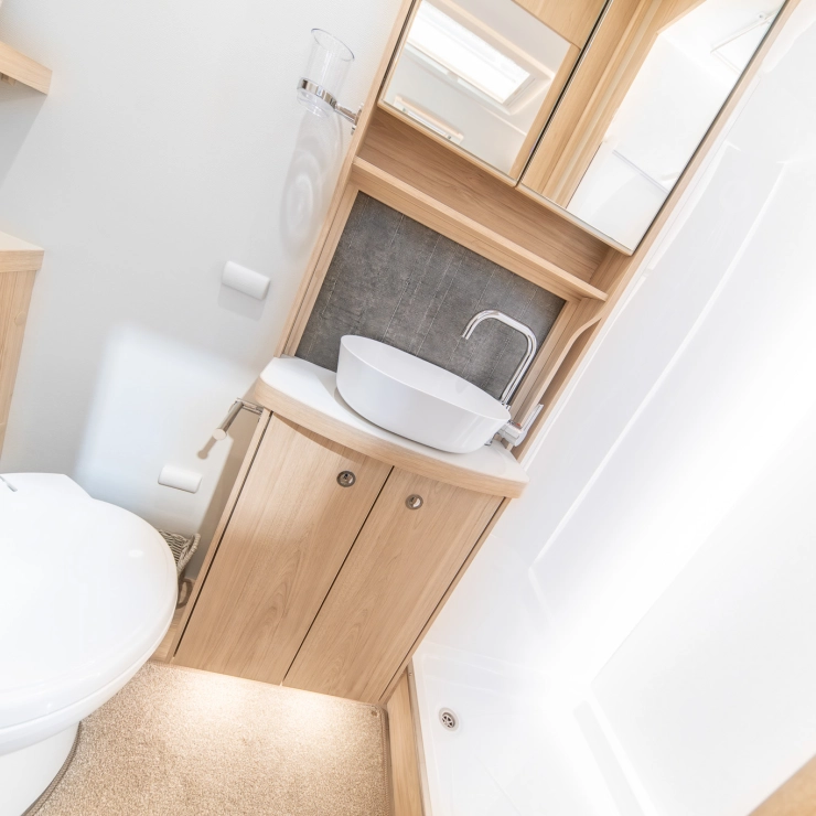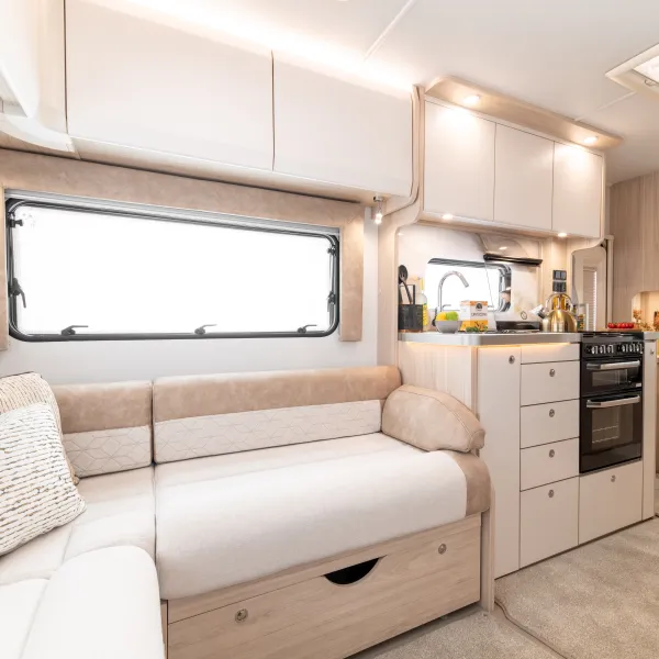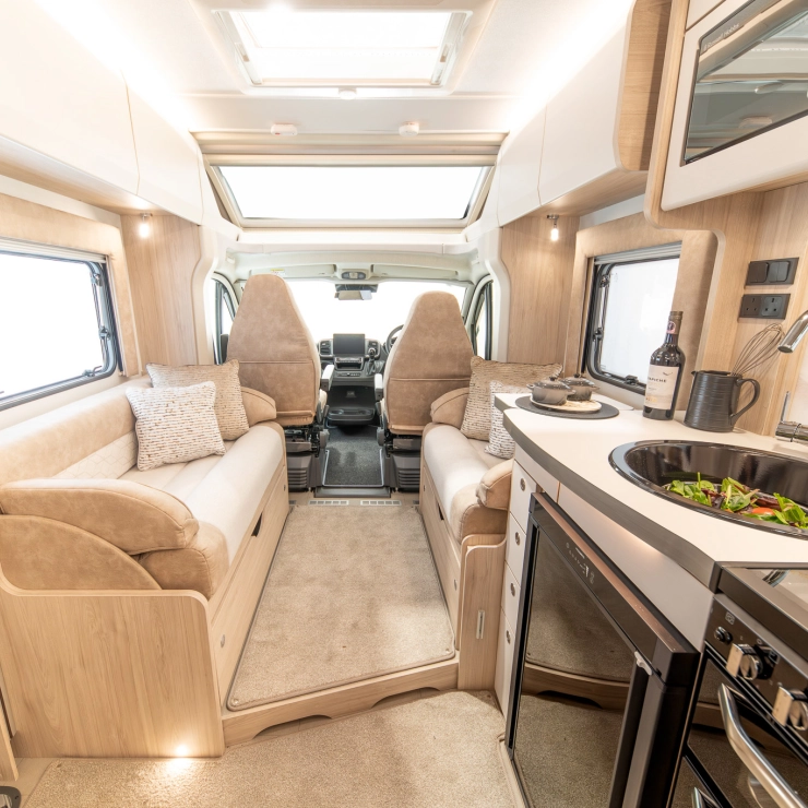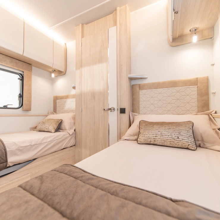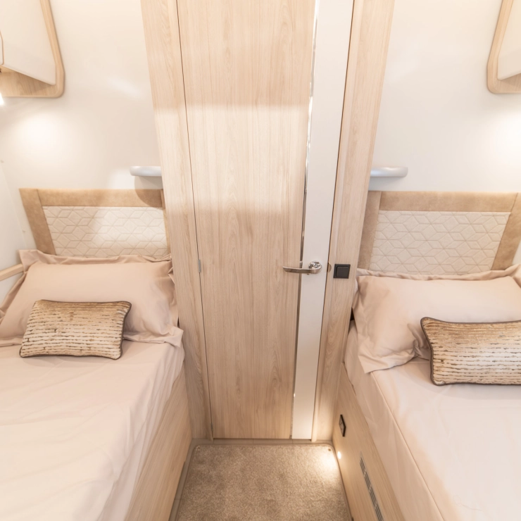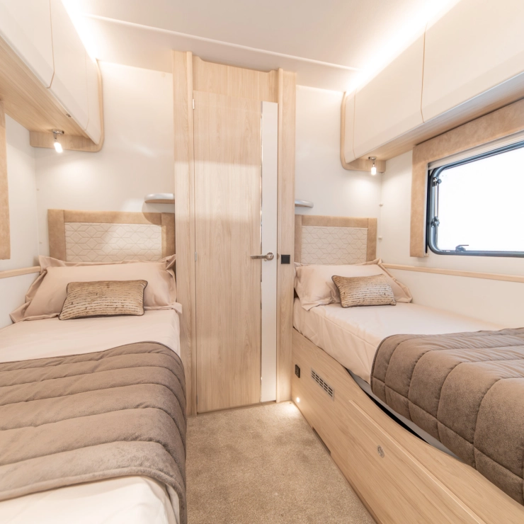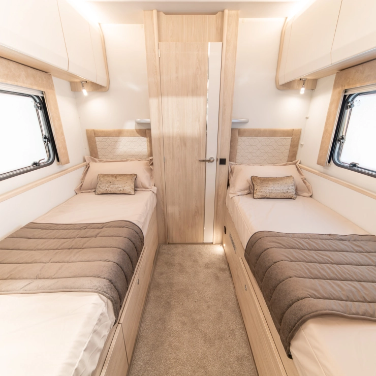Designed for comfort, the Avalon Evolve 285 features fixed single beds and a spacious full-width rear bathroom. The front lounge converts to a double bed, with foldaway travel seats neatly hidden beneath. Perfect for couples desiring flexibility and luxury.