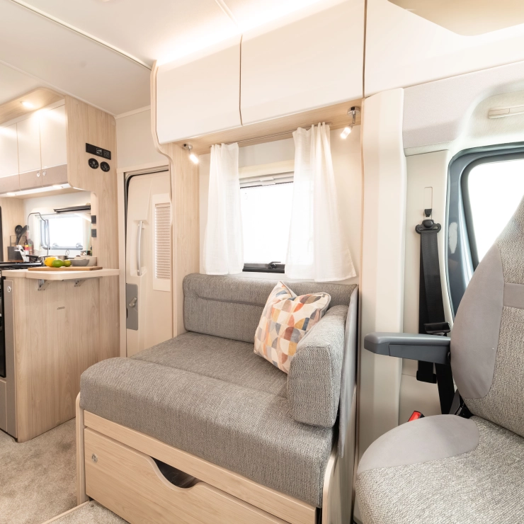 The Whirlwind GT 120 is built for sociable travel with its spacious rear lounge that converts into a generous double bed. From its curved roof and quad-light rear panel to the light wood finish inside, it delivers both function and flair. USB ports, leather accents, come as standard.