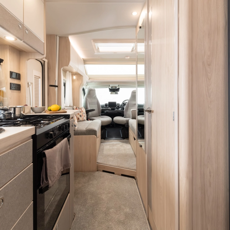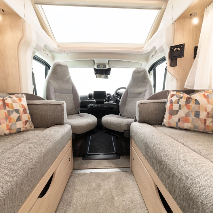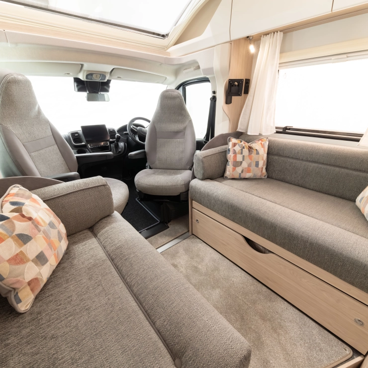 Inside, the light wood interior is paired with durable, darker upholstery and cosy soft furnishings, offering a smart and welcoming space.