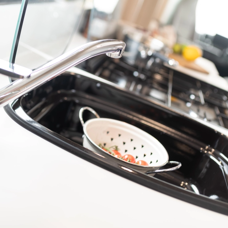 • Black gloss enamelled sink with glass lid creating additional work surface and removable drainer