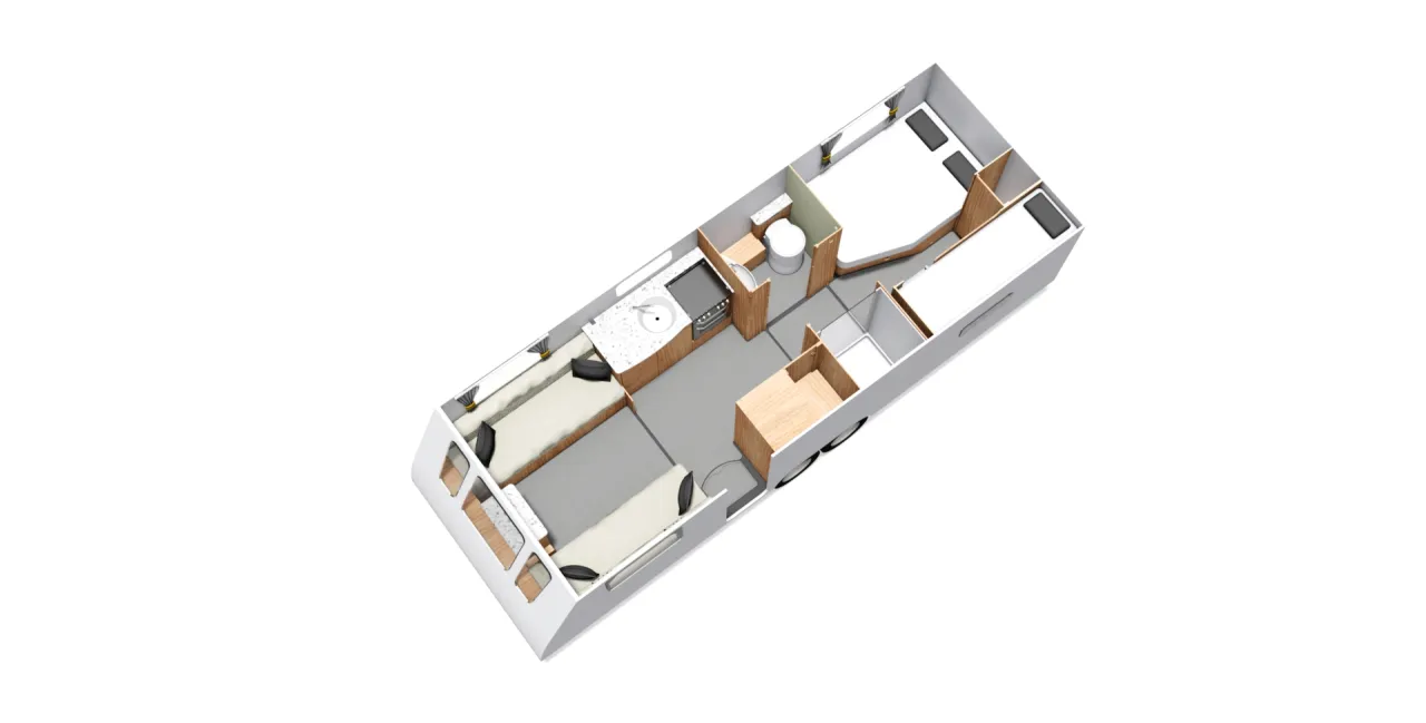 The standout feature of this caravan is its spacious rear bedroom. It hosts a fixed French bed and two bunks, making it perfect for families with little ones. The clever layout of this unique bedroom arrangement is made possible by the extra width of the model. What's more, there's the flexibility to create a private en suite bedroom simply by closing the door that separates the kitchen and central washroom.