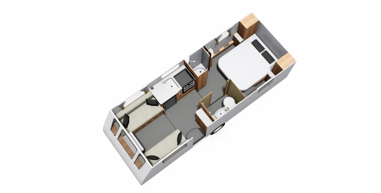 Introducing the single-axle Aurora; it has a layout that’s now become a classic, with a rear bedroom featuring a retractable island bed, separated from the rest of the caravan by washing facilities that span the width of the caravan.