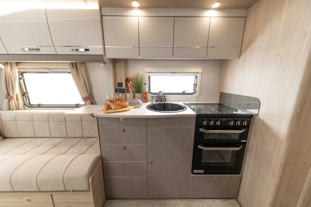 That large wardrobe, along with overhead lockers over the double bed, should mean that you can keep all the children’s clothes and detritus together in one area as well: there won’t be any need for them to spill out everywhere else. And as the washroom straddles the caravan just in front of here, they will have easy access to it at night too.
